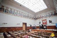 Fryz wykonany został na zamówienie w latach 1907 – 1909 przez Konstanty Niemczykiewicza. Wzorowany był na szkicach Jana Matejki. Zdobienie jego wykonane jest w stylu neogotyckim. Sala ozdobiona jest herbami wszystkich ziem i województw i ziem Polski, jakie znajdowały się w granicach kraju do 1795 roku. Ponadto w auli znajduje się religijno-alegoryczny tryptyk Stanisława Dębickiego.