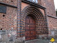 Bestiariusze zdobią boczne portale, natomiast portal główny zbudowany został z czerwono-czarnej cegły tworzącej specyficzne pasy.