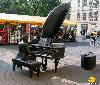 Odlana z brązu figura przedstawia Artura Rubinsteina we fraku, siedzącego przy fortepianie, którego dłonie oparte są na klawiaturze. Podniesiona klapa instrumentu przypomina ptasie skrzydło. Obok położono klucz wiolinowy.